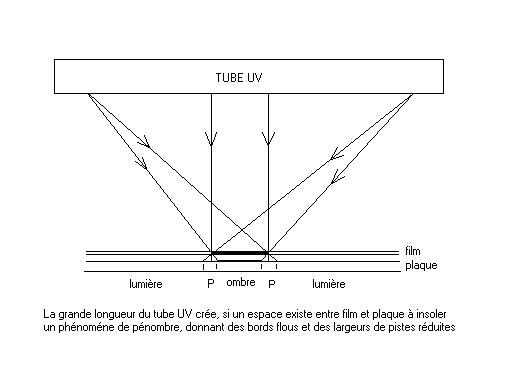 Pour éviter un tel défaut, nous conseillons de cloisonner la boîte d'insolation à l'aide de plaques d'alu ou simplement de carton noir. En réalisant des compartiments de 20 x 20 cm environ, les rayons les plus obliques sont éliminés et le tirage UV donne de meilleurs résultats. Voir Figures.